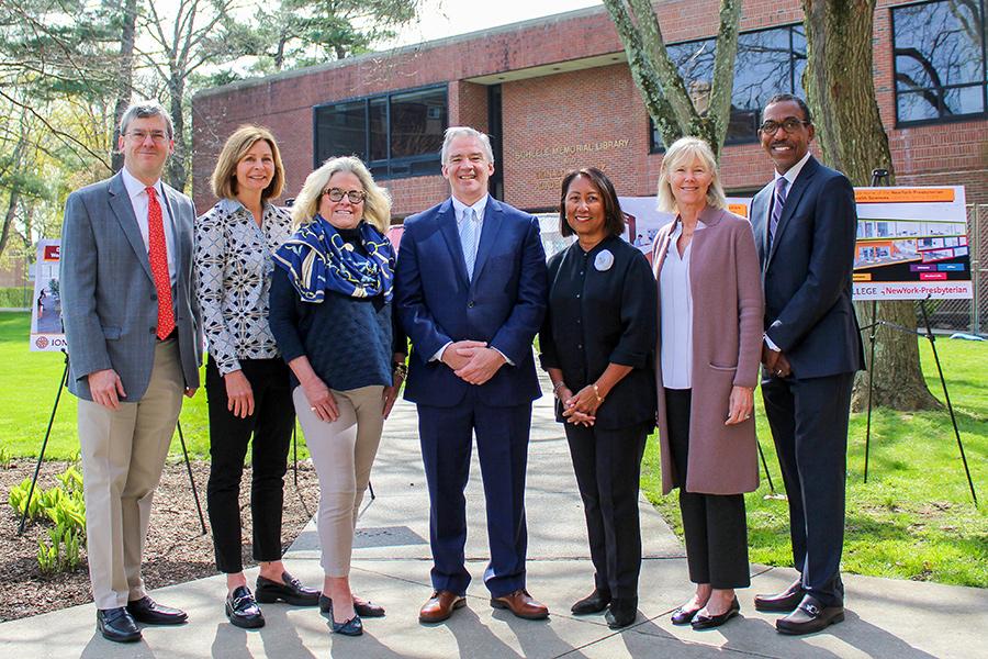 Leaders gather in front of the future home of the NewYork-Presbyterian Iona School of Health Sciences on April 21, 2022. Left to right: William C. Fredericks, Bronxville Trustee; Helen Knapp, Bronxville Trustee; Mary C. Marvin, Bronxville Mayor; Seamus Carey, Ph.D., Iona President; Wilhelmina Manzano, NewYork-Presbyterian Group SVP and Chief Nursing Executive; Mary Taylor Behrens, Bronxville Trustee; and Darrell P. Wheeler, Ph.D., MPH, ACSW, Iona Provost. (Photo credit Lea Carpanzano/Iona College.)